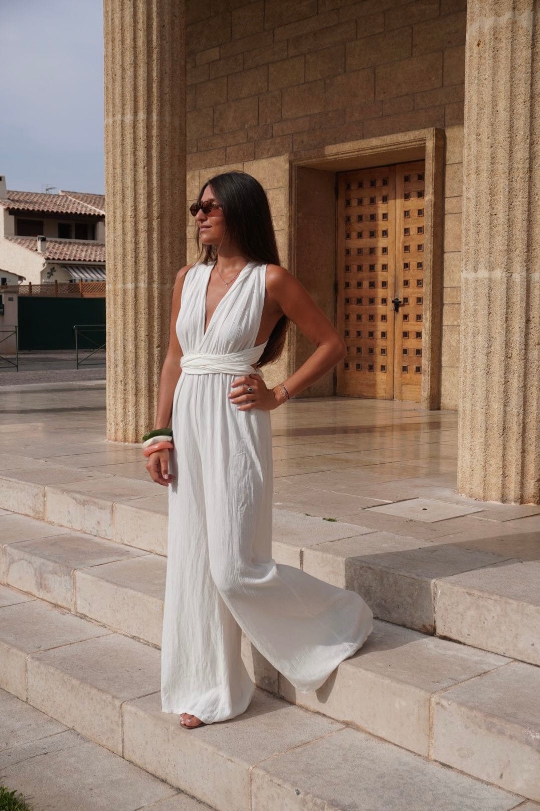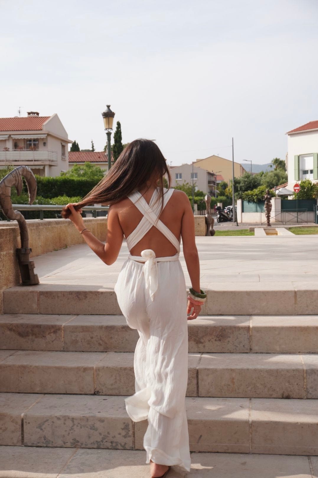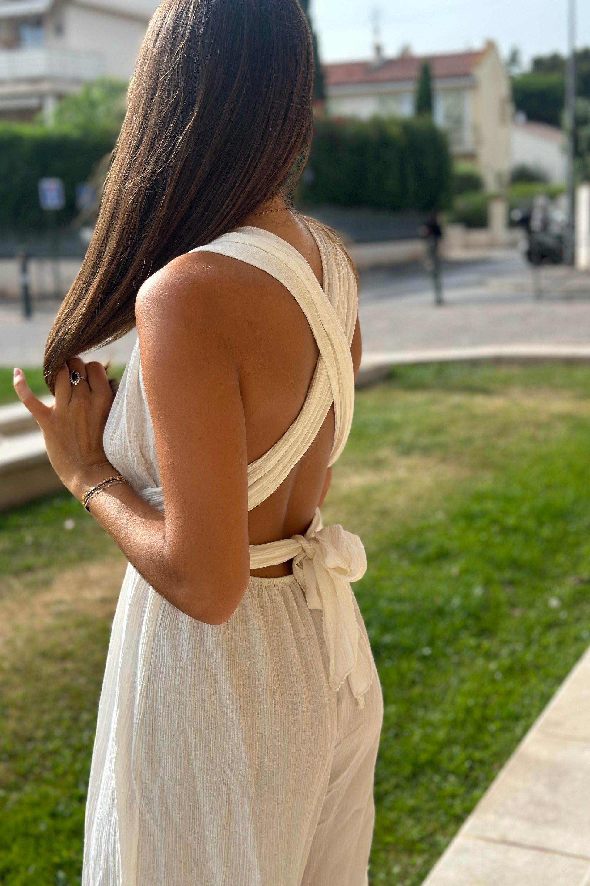 Stella se noue de plein de façons : autour du cou, croisée, en bustier… C’est la pièce caméléon, parfaite pour varier les looks sans se changer. Son tissu doux et texturé ajoute une touche sophistiquée à chaque version.