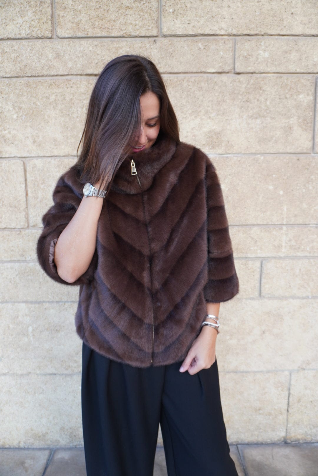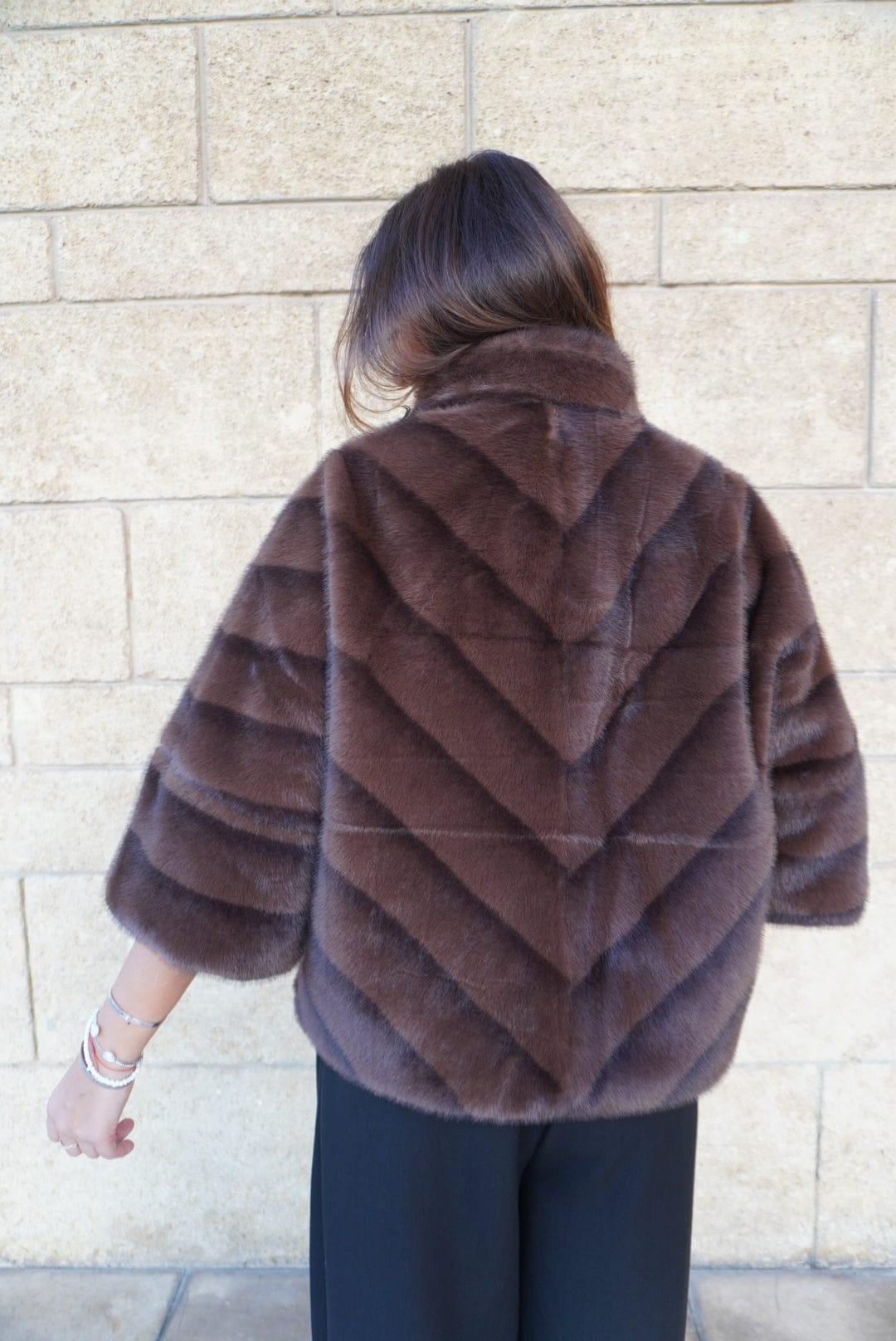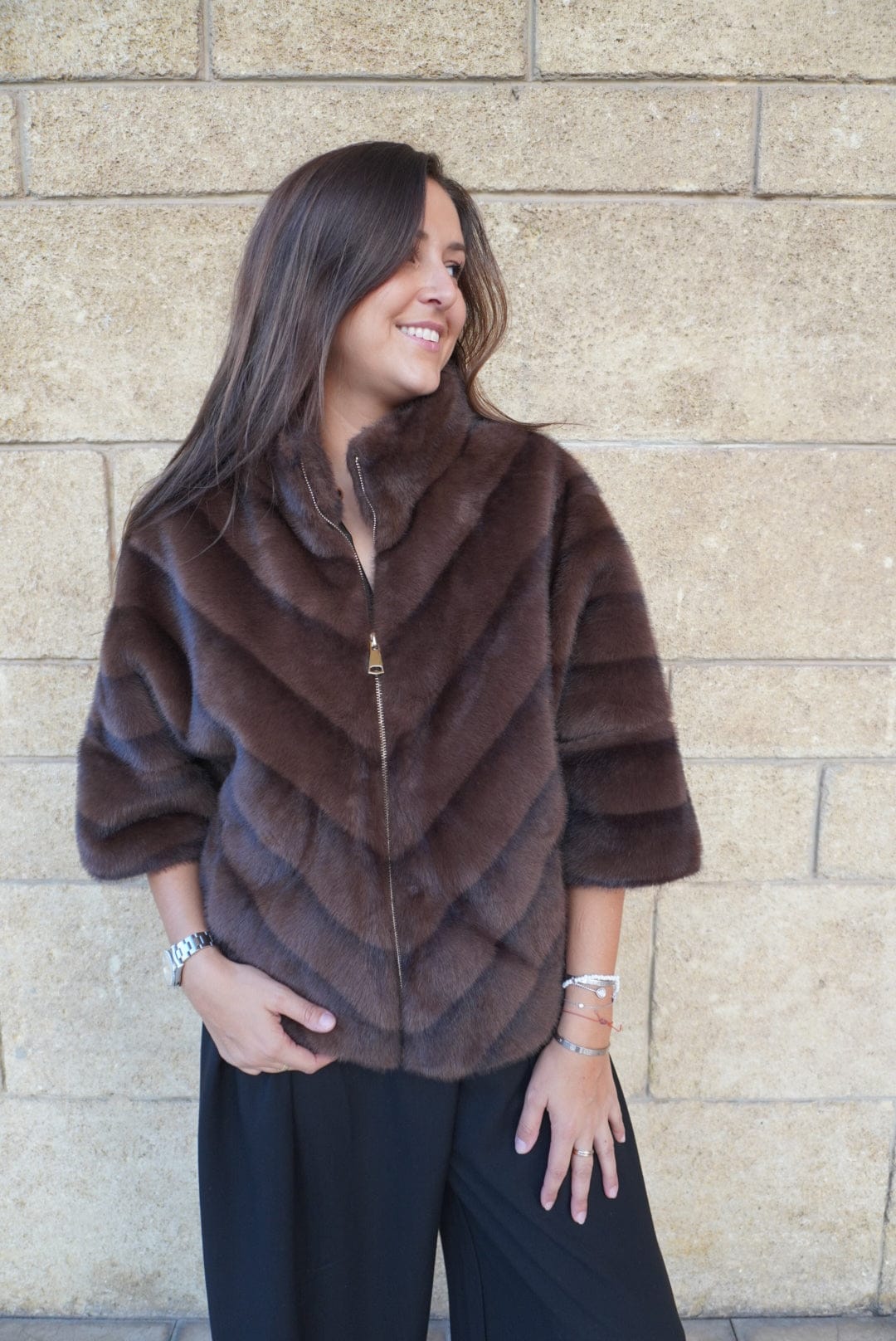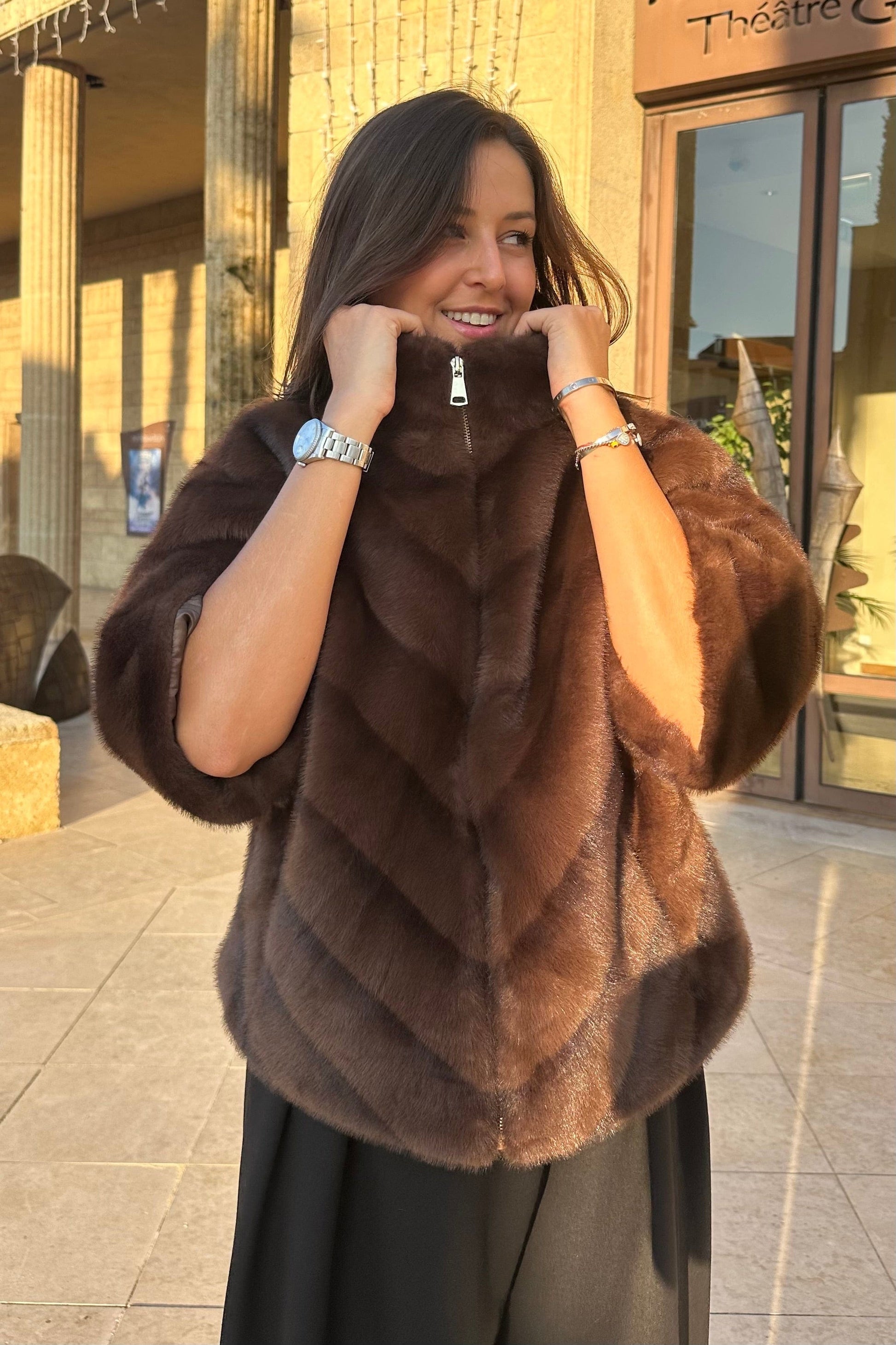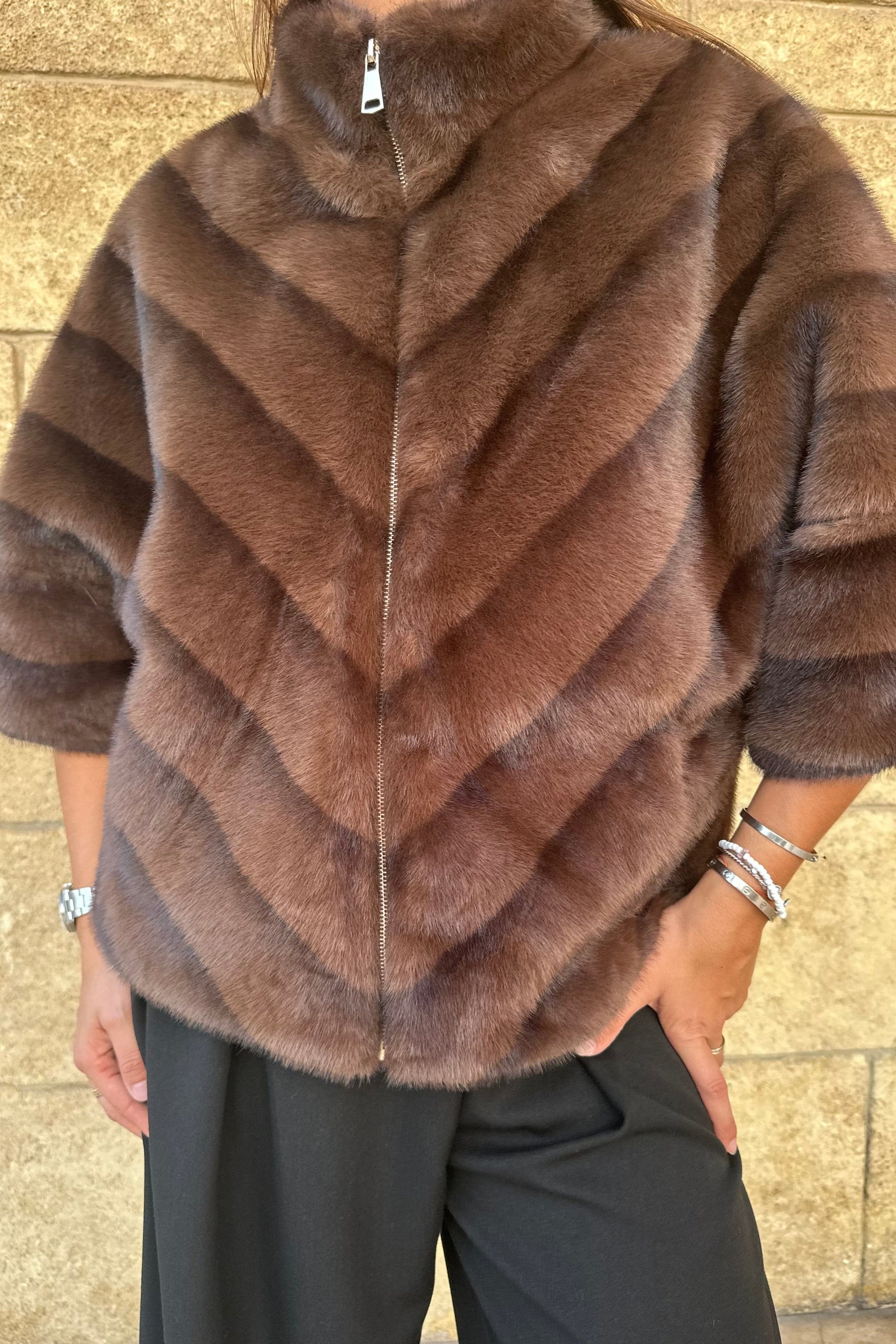 Élégante et enveloppante, la fausse fourrure Léona séduit par son motif en chevrons délicatement ombrés, qui jouent subtilement avec la lumière. Sa teinte chocolat profonde apporte une touche raffinée et intemporelle à toutes vos tenues. Parfaite sur un pull, une chemise ou une robe, elle allie confort et allure chic. Sa coupe manches 3/4 et sa fermeture zippée soulignent une silhouette moderne et féminine.